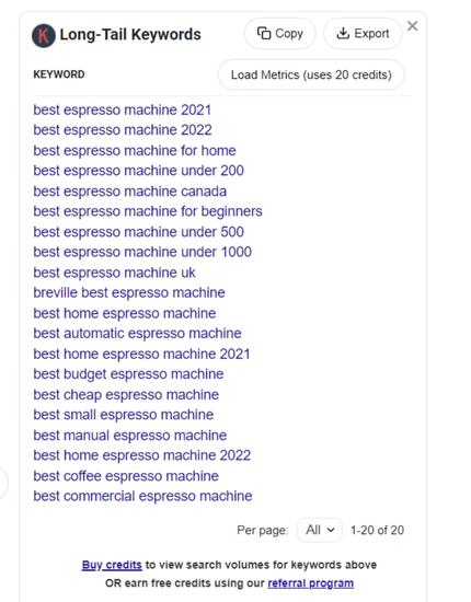 - It shows you a list of related keywords that you can target. You can then conveniently export them in CSV.