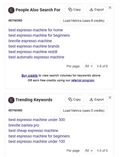 - The Keywords Everywhere extension also shows a list of “People Also Search For Keywords”, “Trending Keywords”, and “Long-Tail Keywords” so you can get ideas for other terms that you can target. You can Copy or Export the data, quickly and easily. The free version only shows the keywords, while the paid version shows the volume data.