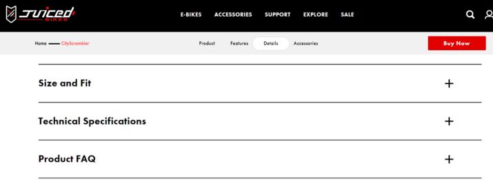 For example, the website Juiced Bikes has Size and Fit, Technical Specifications, and Product FAQ section on their product pages. This helps visitors get as much information about the product as possible.