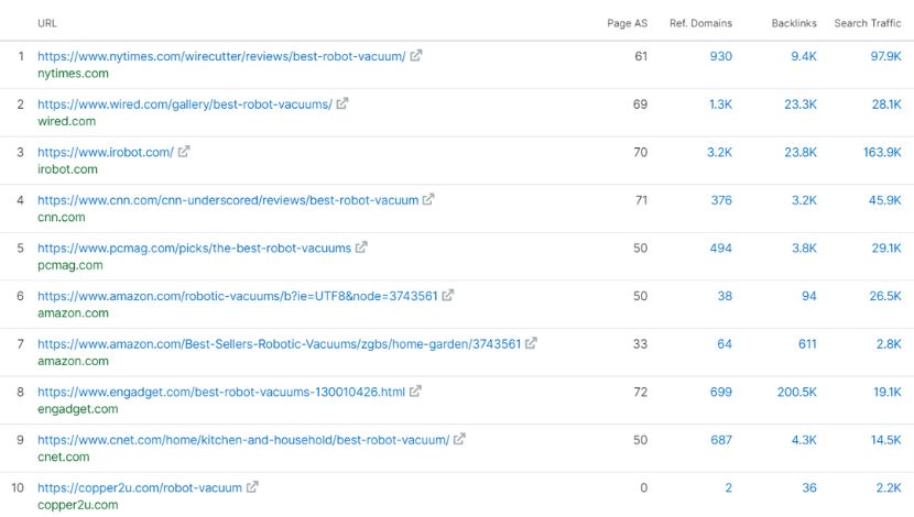 Looking at the SERP (Google top 10 Search Results) we can see many best product guides by authority websites such as NYTimes, CNN, Wired, also Amazon’s Robotic Vacuums Product Category Page, etc., but there are no product pages at all.