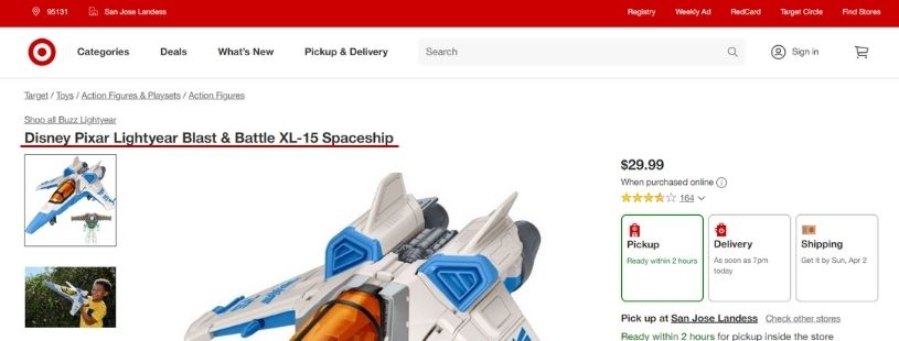 For example if a person is looking to buy the product “Disney Pixar Lightyear Blast & Battle XL-15 Spaceship”. There are several things they can type in Google: