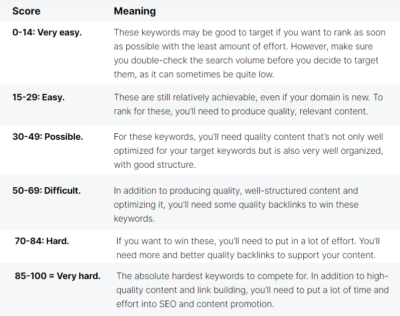 Generally, SEO tools display keyword difficulty as a number between 0 to 100, with 0 being the easiest and 100 being the hardest.
